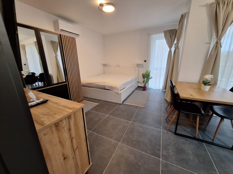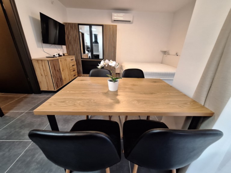 Az igényesen berendezett szoba egy kényelmes franciaággyal, egy jól felszerelt konyhával és egy tágas zuhanyzós WC-s fürdőszobával rendelkezik. Az apartman teraszán kényelmesen elfogyaszthatja a reggeli kávéját.